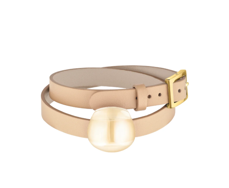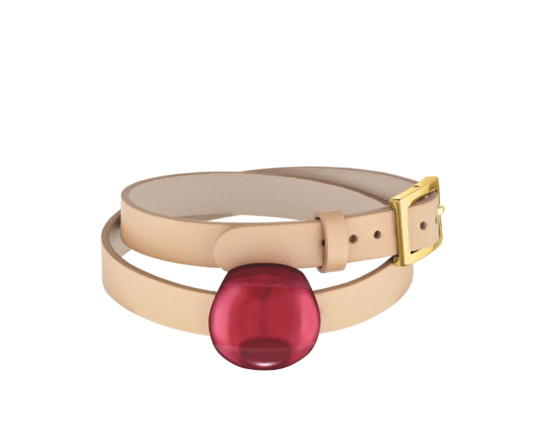 Cuir, plaqué or 18 carats, cristal rouge : 230 €