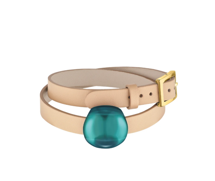 Cuir, plaqué or 18 carats, cristal vert profond : 230 €